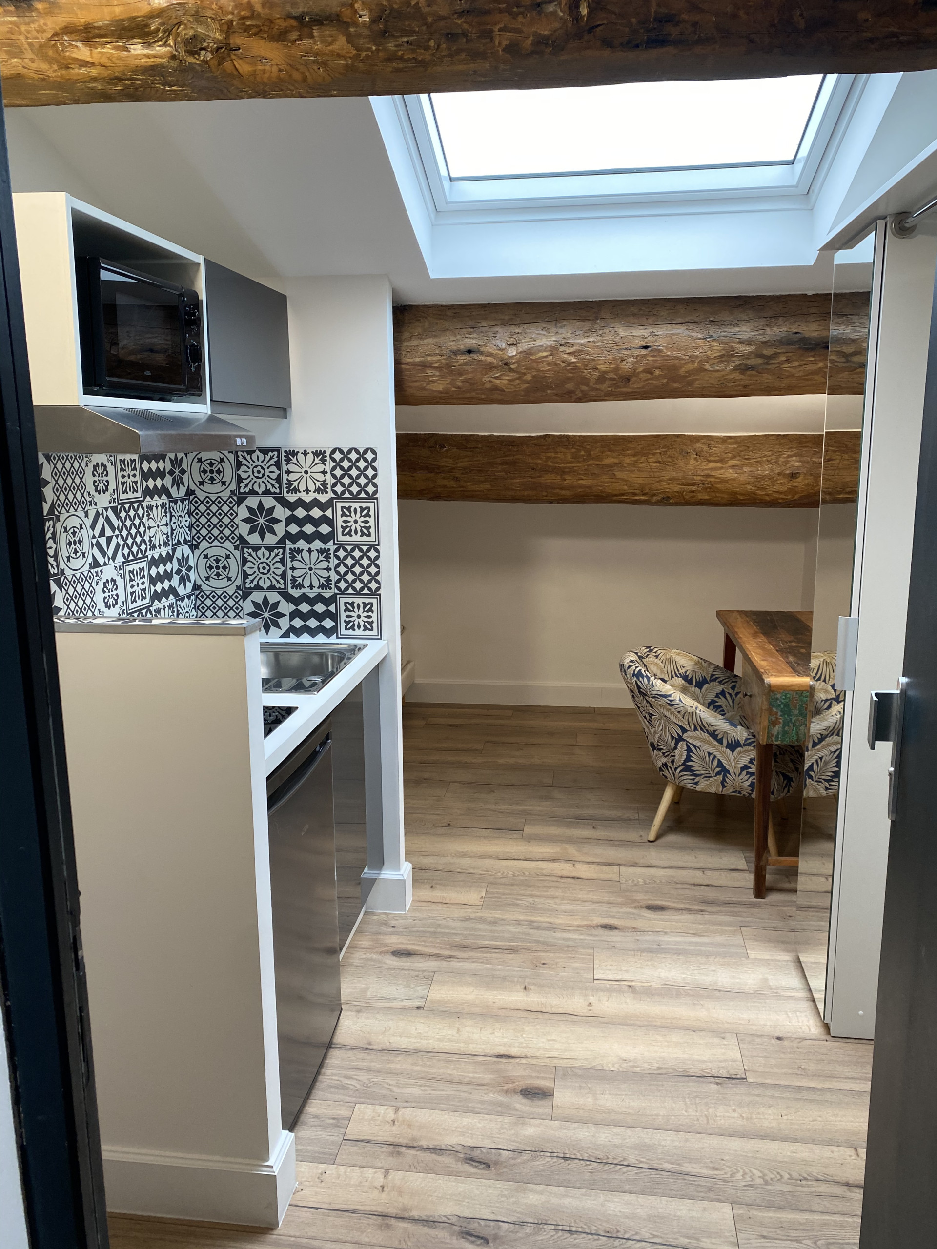 Studio pour 2 personnes au 1er étage, avec terrasse. Lit 180x200, coin bureau, kitchenette, salle d’eau avec WC. Le Cep, enraciné comme le pied de vigne, offre calme et sobriété pour un séjour professionnel ou étudiant.