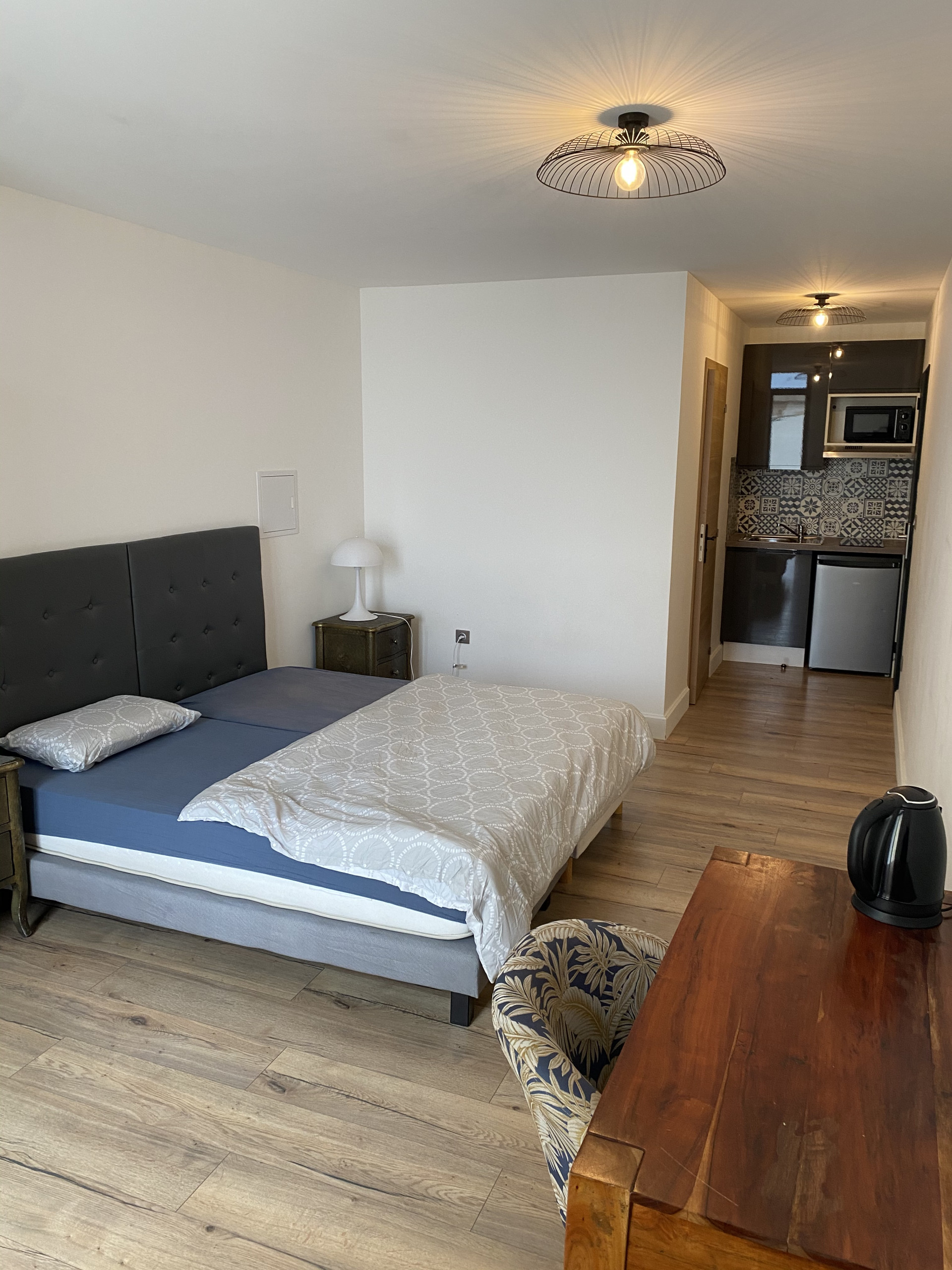 Studio pour 2 personnes au 1er étage, avec terrasse. Lit 180x200, coin bureau, kitchenette, salle d’eau avec WC. Le Cep, enraciné comme le pied de vigne, offre calme et sobriété pour un séjour professionnel ou étudiant.
