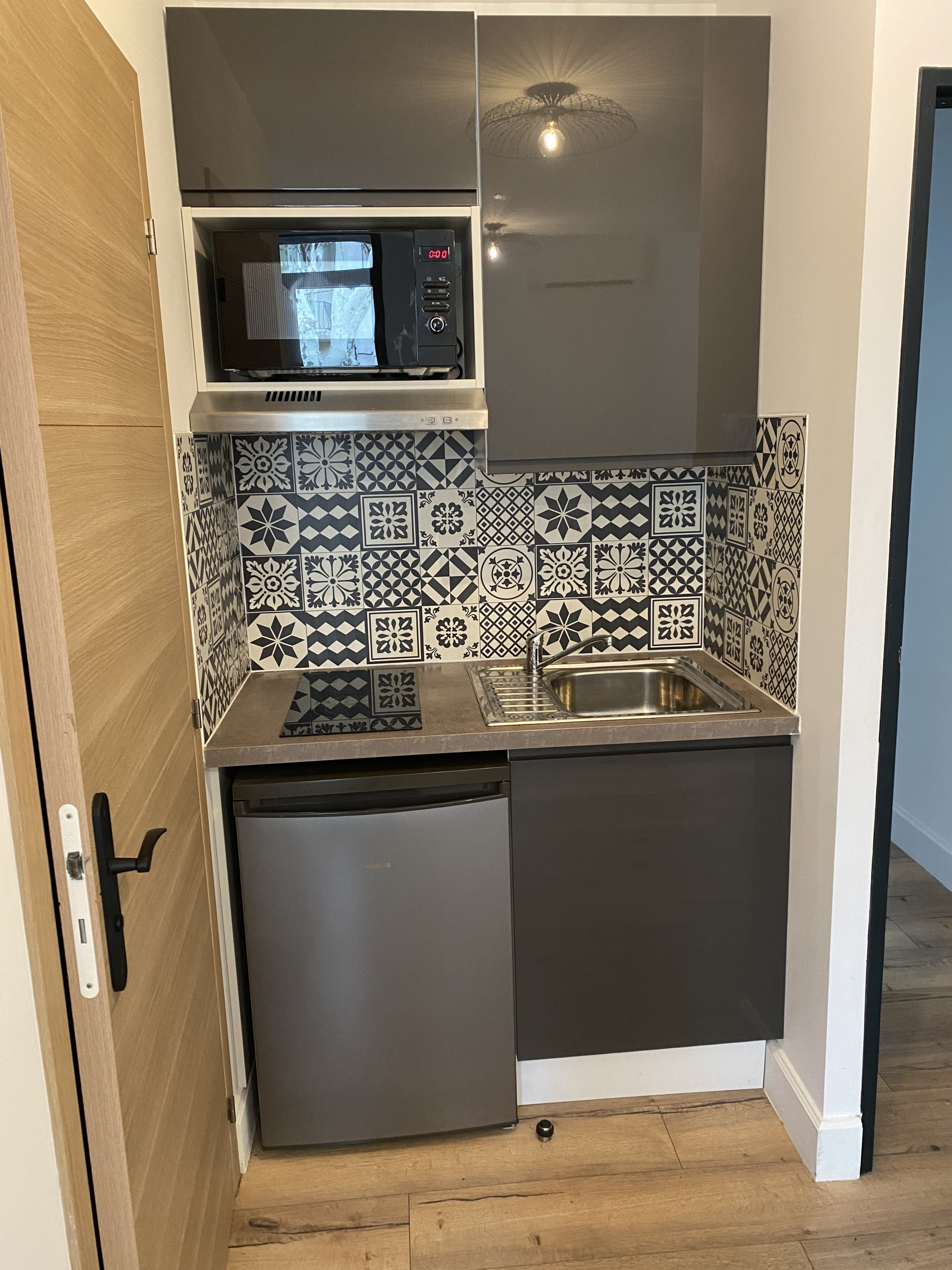 Studio for 2 people on the 1st floor, with terrace. 180x200 bed, office corner, kitchenette, bathroom with WC. Le Cep, rooted like the vine stock, offers calm and sobriety for a professional or student stay.